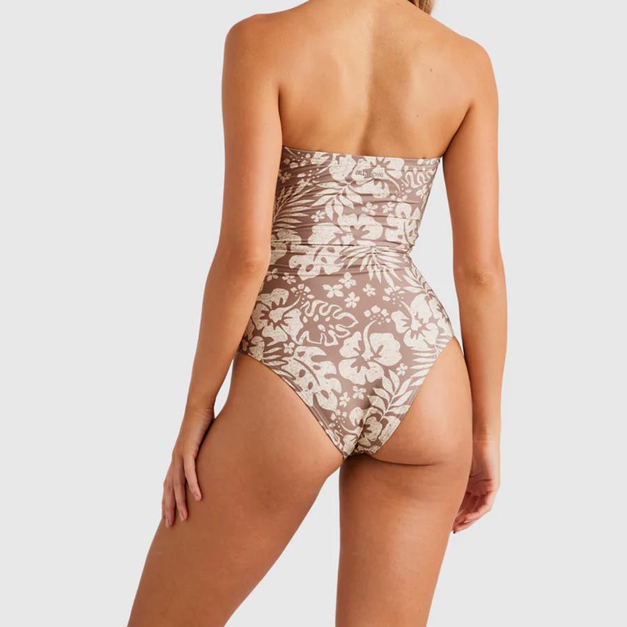 WOMENS OFF TROPIC DREW ONE PIECE Style: UBJX100305 Colour Code: CME0 Product Type: Drew bandeau one-piece Fabric: Recycled Peach Stretch Detail: Cut out Tie front Bum Coverage: Hi retro Leg: Medium leg Straps: Adjustable & removable Print: All-over Branding: Embroidered logo