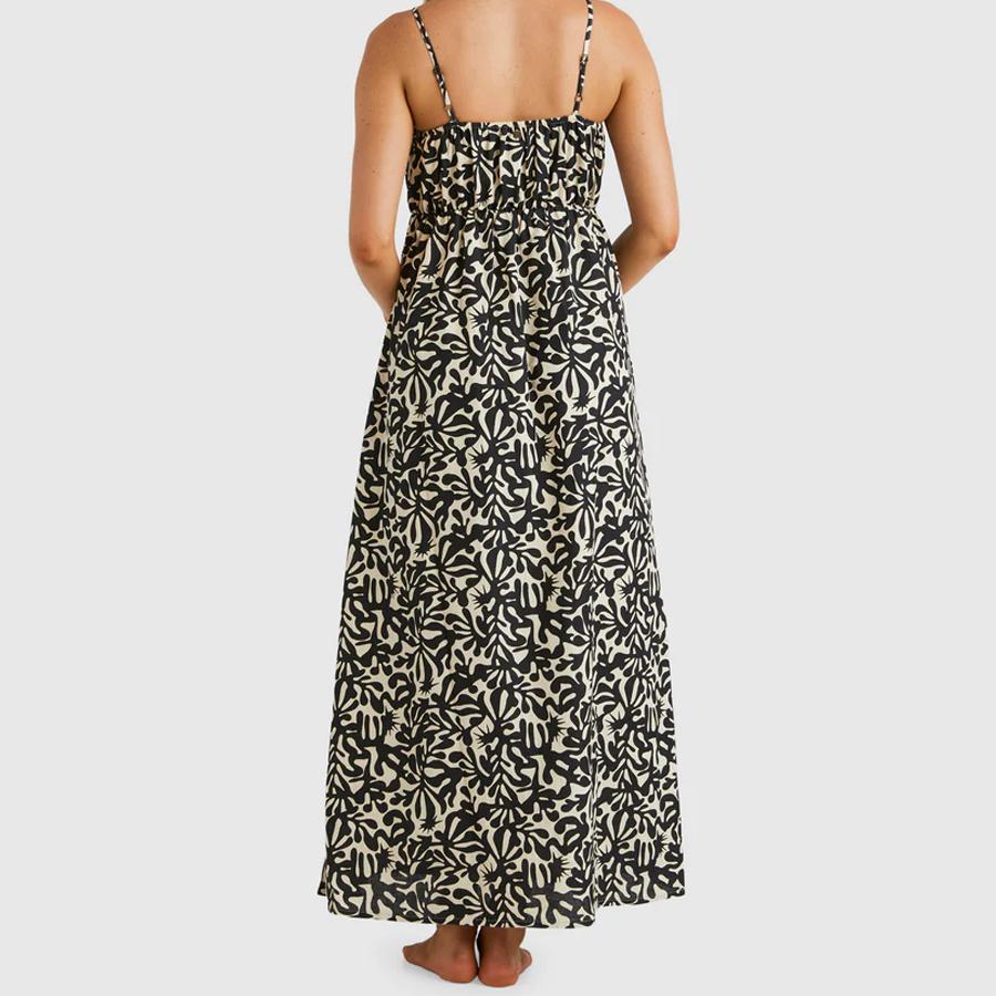 Palm Grove Maxi Dress Colour - OFF BLACK Collection: Sunshine Diaries collection Fabric: Viscose cotton linen blend plain weave fabric Fit: Fitted bodice, easy skirt fit Neck: Straight neck Straps: Adjustable rouleau straps Closure: Fixed closure Branding: Metal coin Other Features: Elasticated flat Materials: [Main Fabric] 44% Cotton, 8% Linen, 48% Viscose