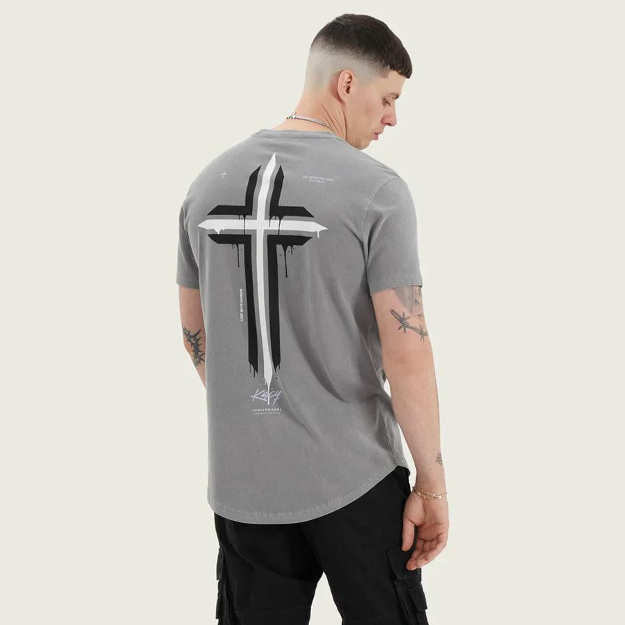 Embrace the edge with the Scutari Dual Curved Tee in Pigment Frost Grey. This slim fit tee pulls no punches, rocking a black KSCY cross graphic front and centre with contrasting grey "KSCY" on top. Turn heads with a standout, paint-dripped white and grey cross on the back, surrounded by gritty KSCY text and emblems. Crafted from midweight 185 GSM cotton jersey, this tee combines recycled and pure cotton for an eco-conscious, raw look and feel. Step into the scene with confidence and authenticity. This tee’s got your back. Key Features: Slim Fit Dual Curved Scoop Hem Versatile Grey Base Subtle KSCY Emblem on Chest Bold, Large KSCY Cross on back 185 GSM Midweight Cotton Jersey